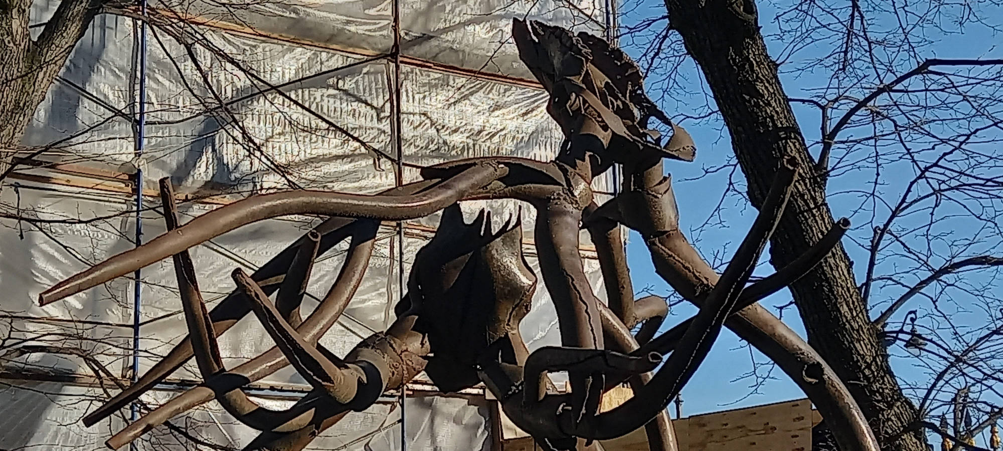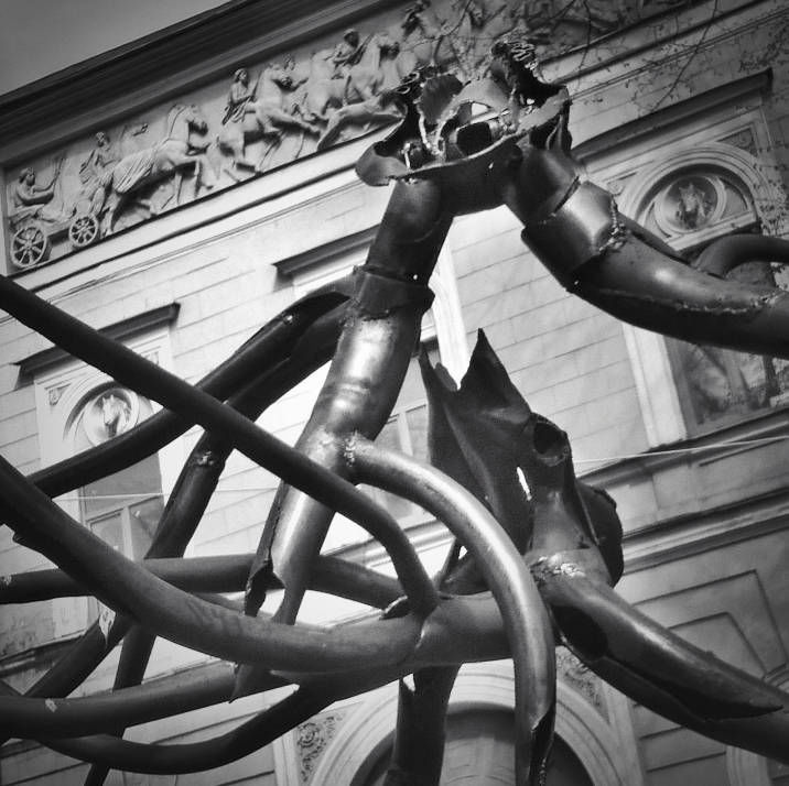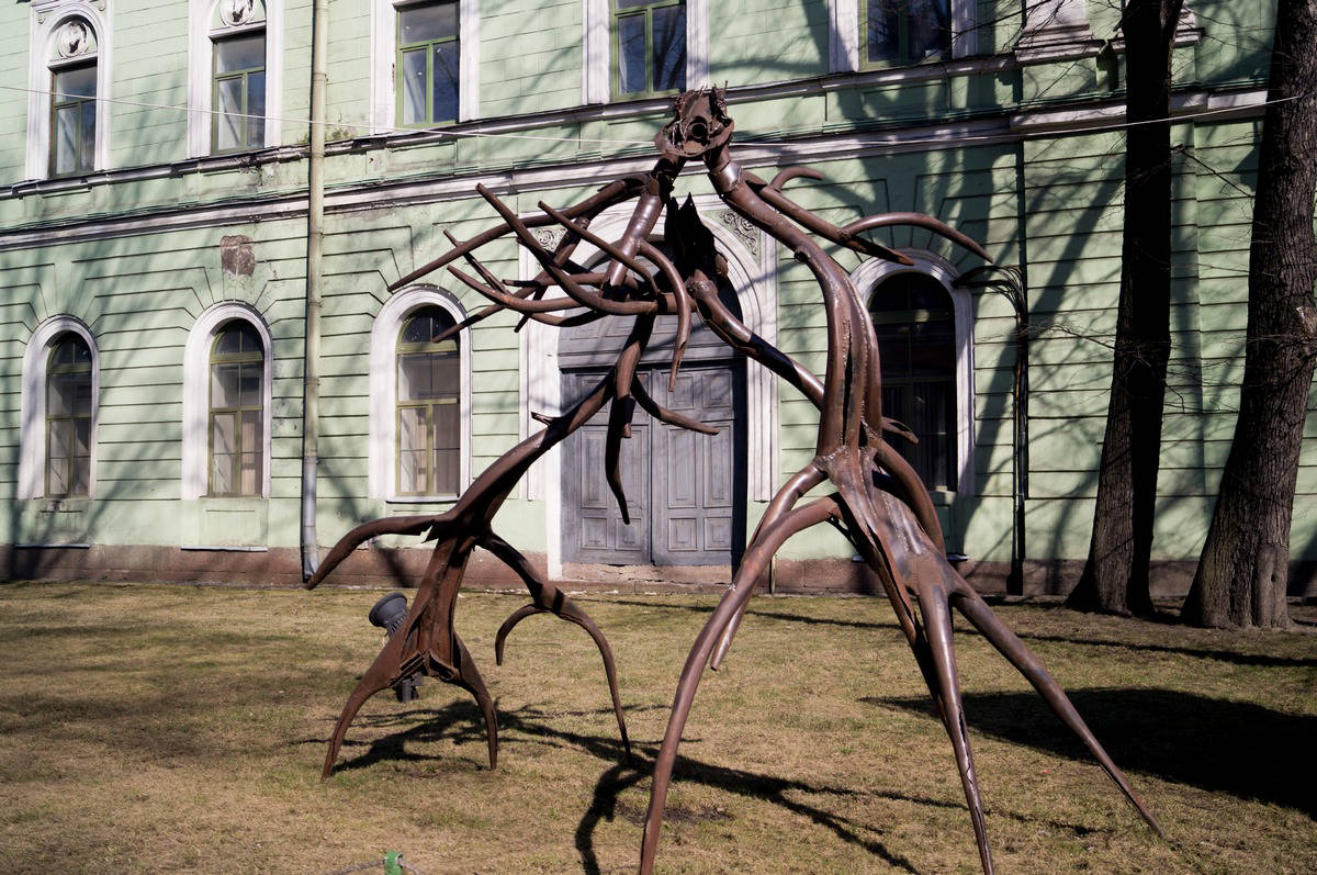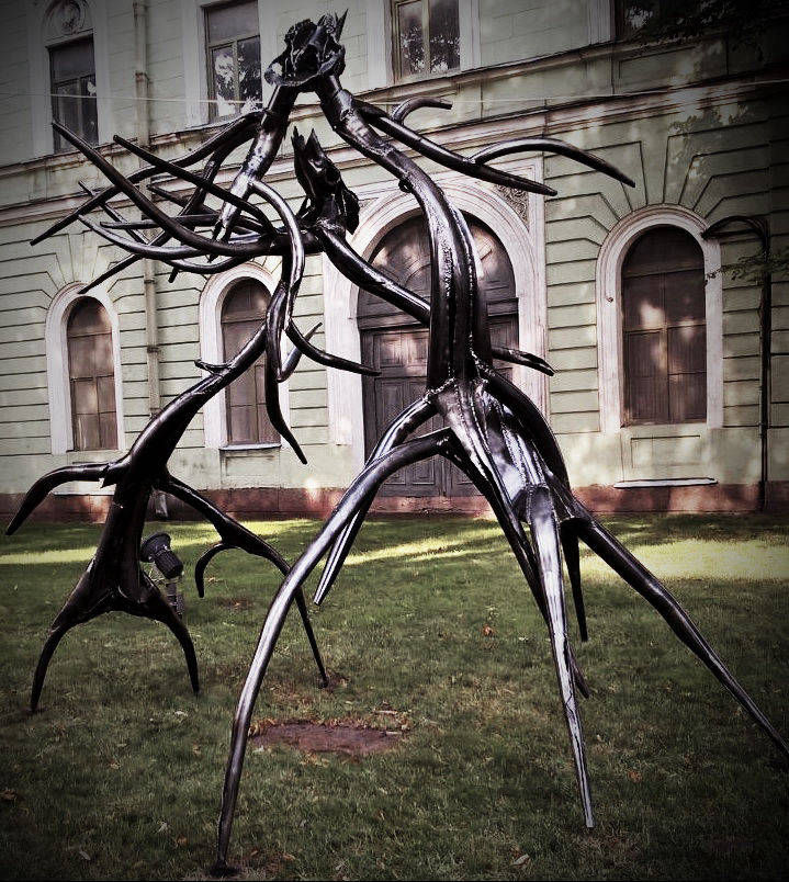 Sometimes, when male deer fight, their horns get interlocked, so that they cannot release and, therefore, die of emaciation. In the image of two noble animals, that fell dead in such a stunning and, at the same time, silly way, I see our human wars and conflicts. A triumphal arch, a deadly embrace, a dark forest.